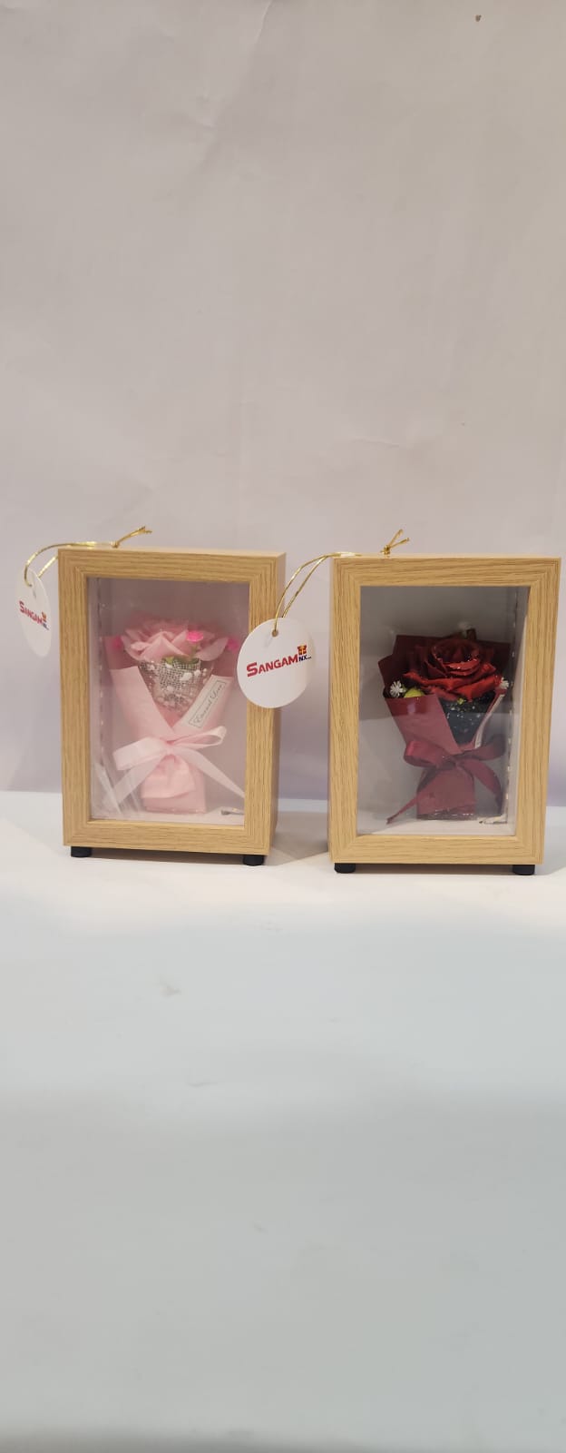 These are artificial soap flower bouquets presented in wooden gift boxes.