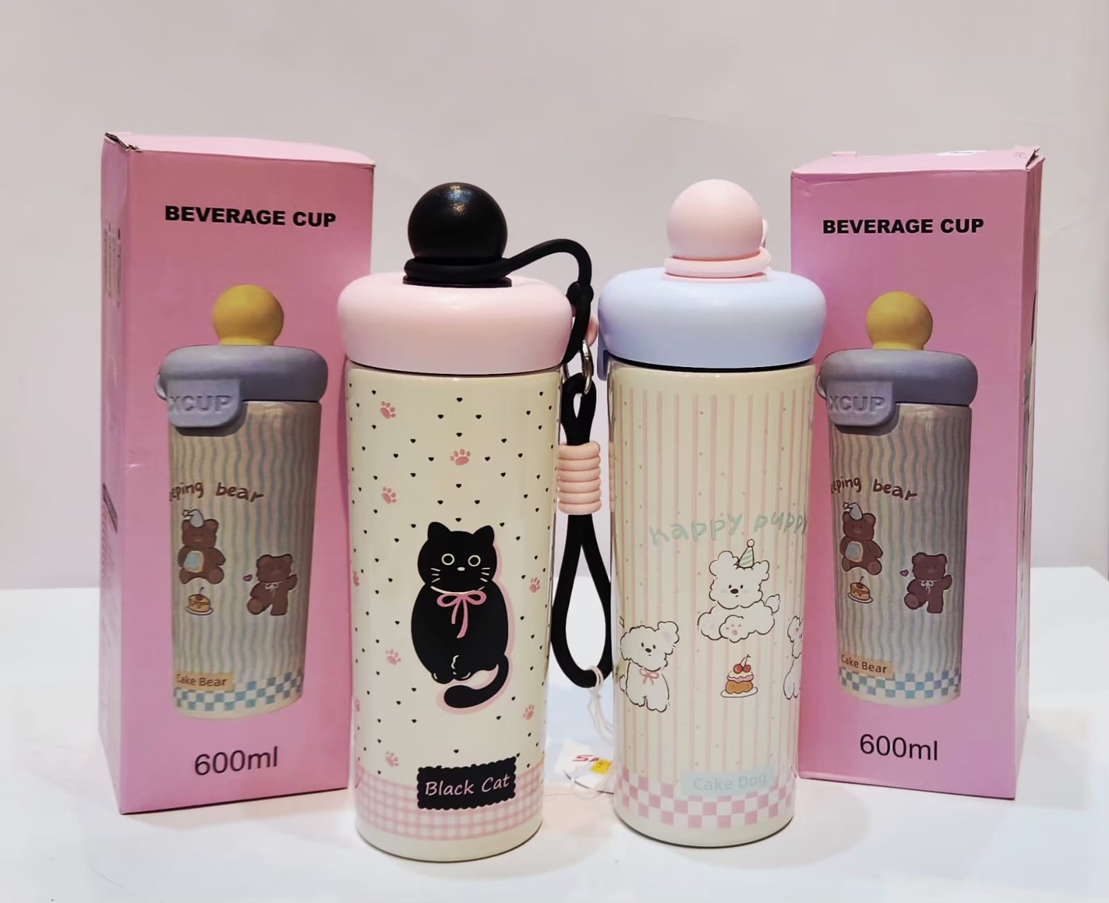 These are Beverage cup insulated beverage cups, available in “Black Cat” and “Happy Puppy” designs. They are made of stainless steel, have a 600ml capacity, and feature a double-walled vacuum insulation to keep drinks hot or cold.