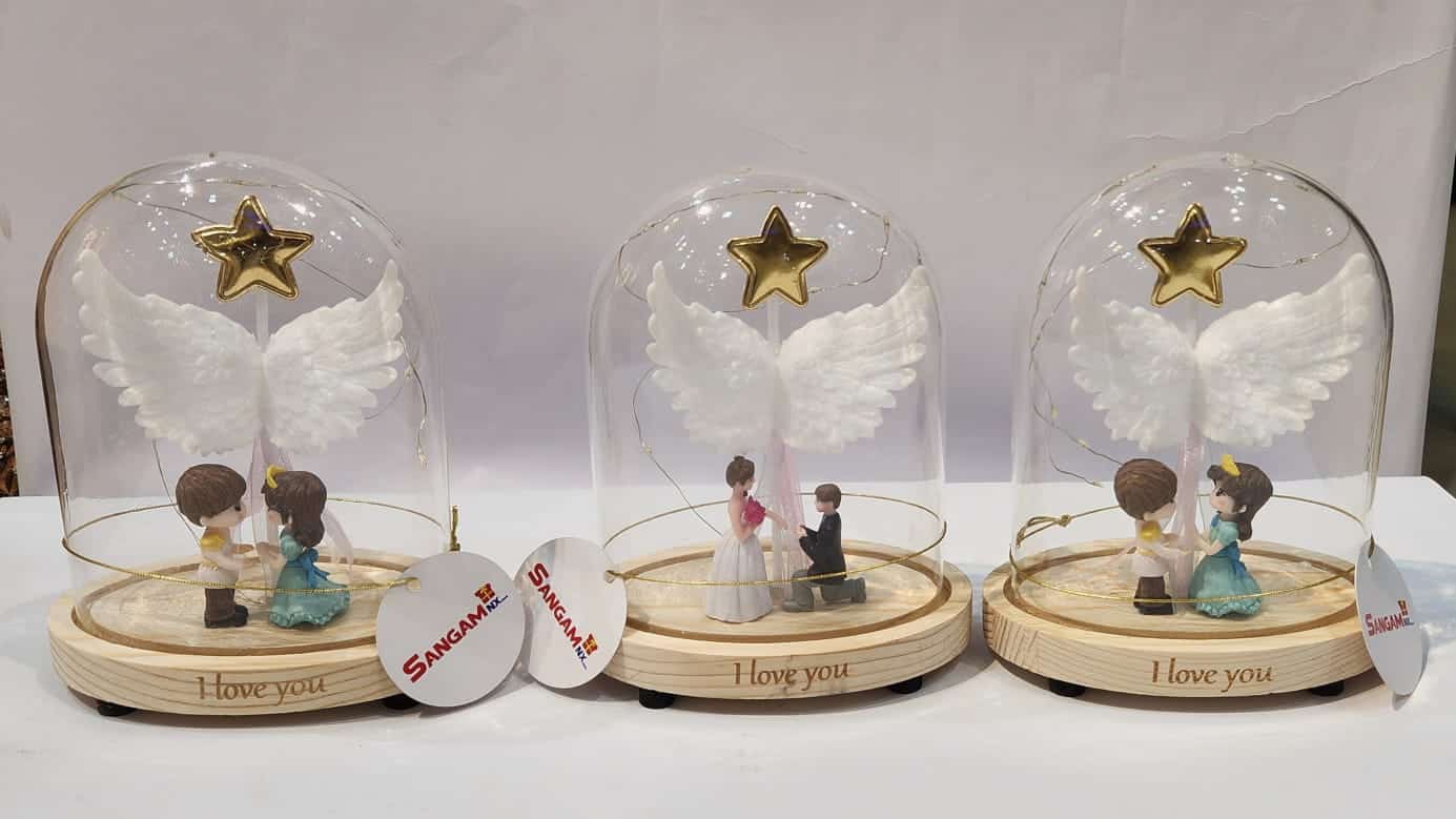 This is an angel figurine in a glass dome with LED lights, featuring a couple and the text “I love you”.