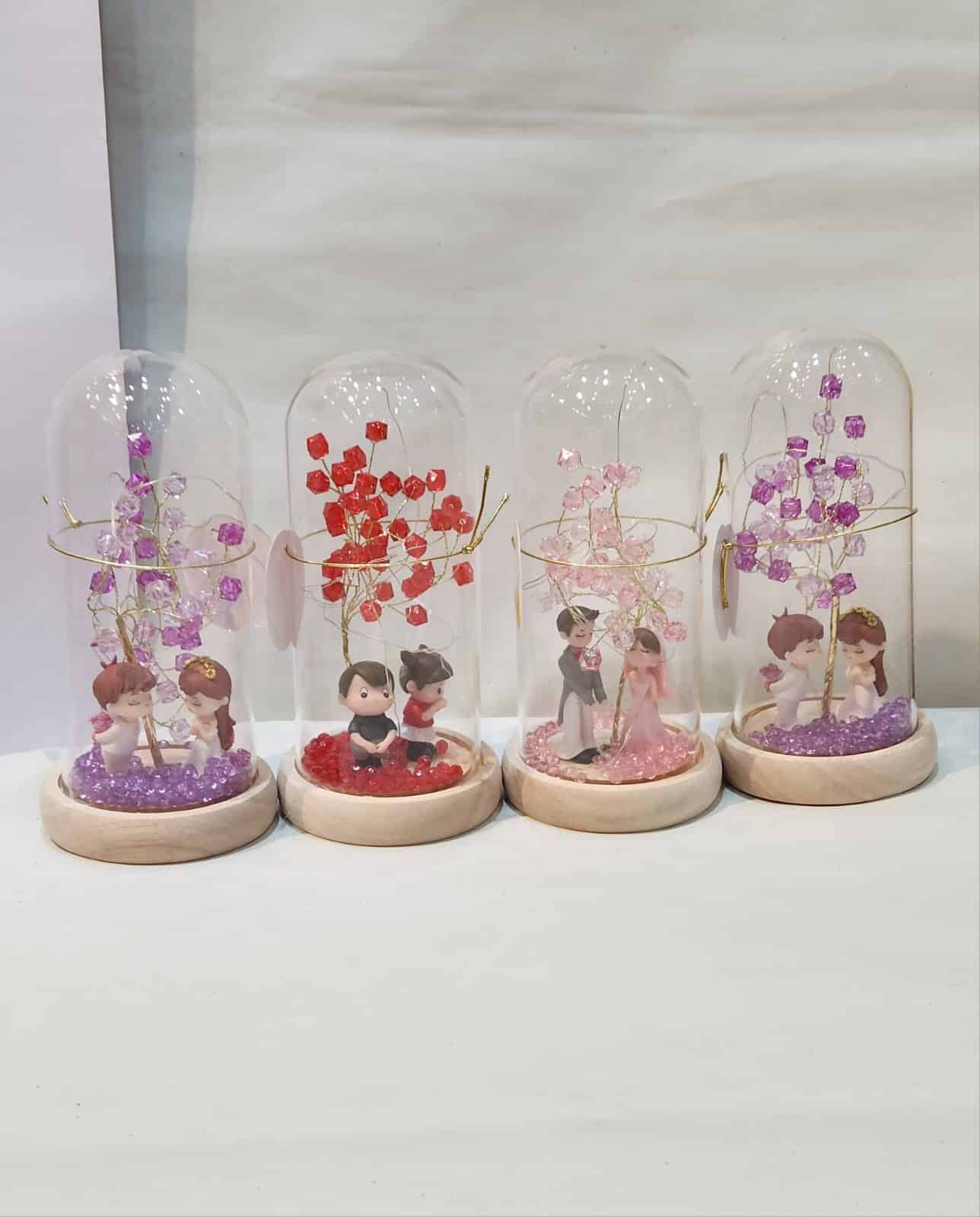 These items are known as glass dome couple showpieces with a crystal or gemstone “wishing tree” and often include LED lights. They are popular decorative items and gifts, widely available for purchase online.