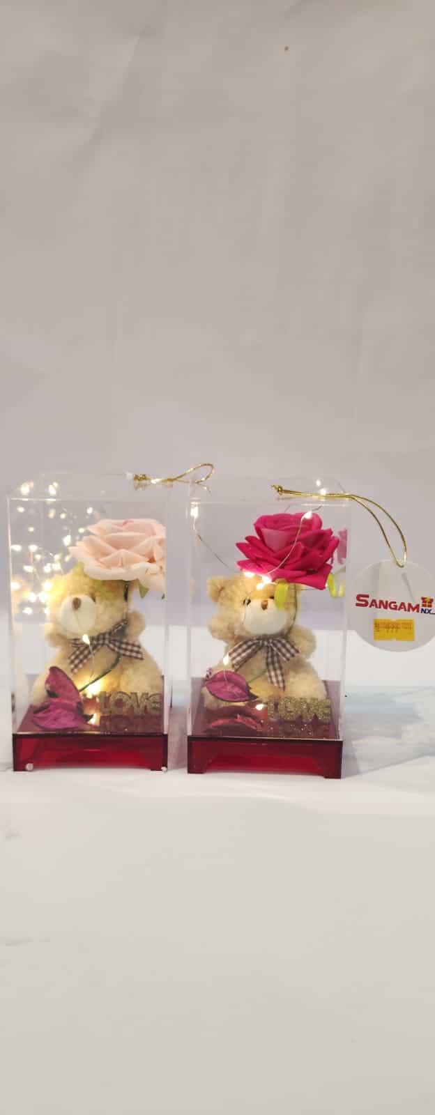 These items are generally known as LED light-up teddy bear and rose gift sets or eternal rose teddy bear gifts in a box. They are a popular gift item, often sold by brands such as “Sangam” (as seen on the tag in your image) and others online.