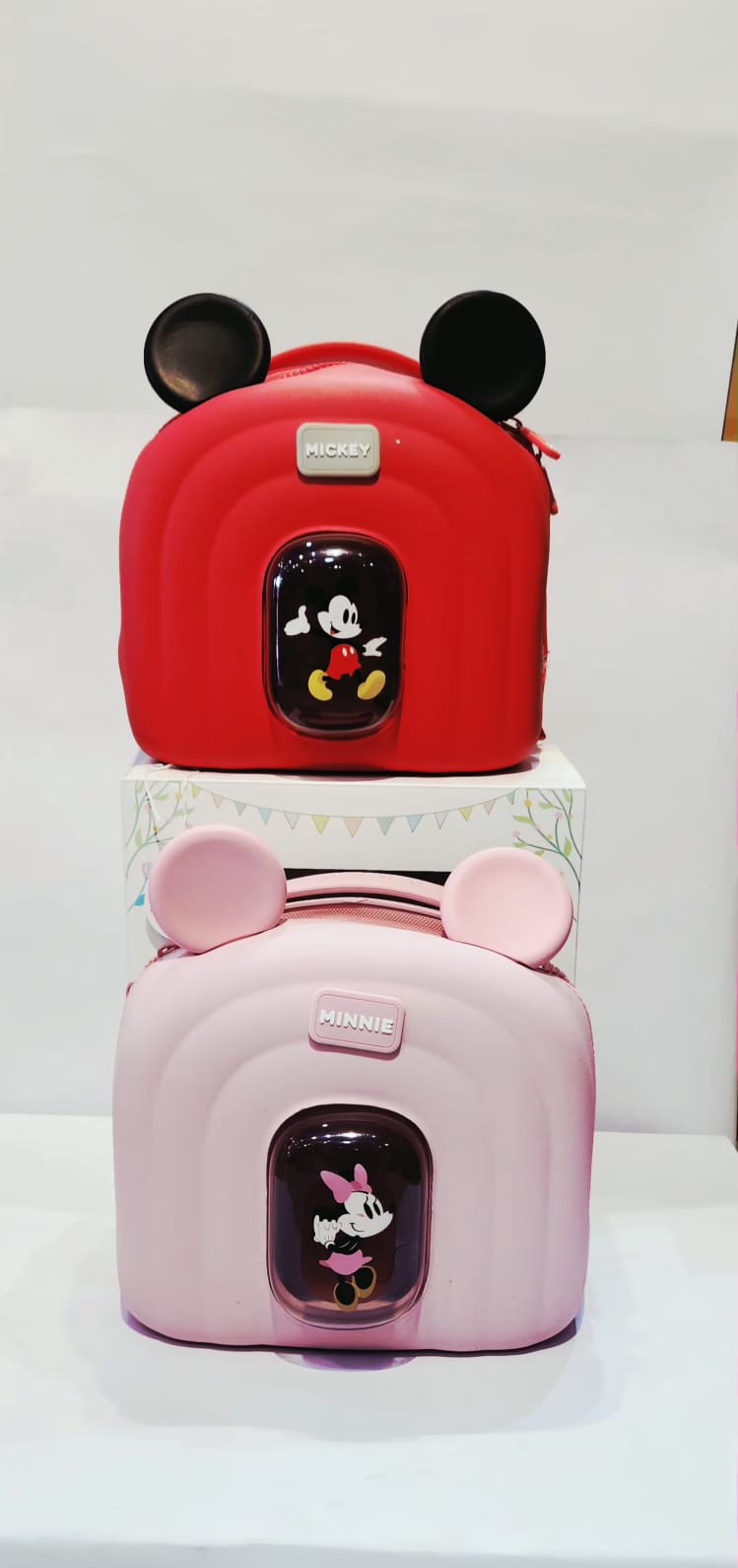 • The red backpack features Mickey Mouse, while the pink one features Minnie Mouse.