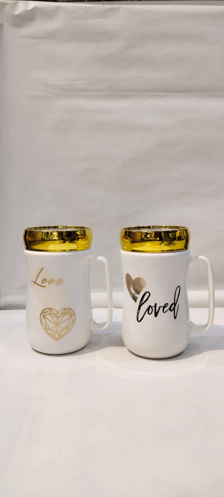 This pair of mugs is part of a couple’s set of white ceramic coffee mugs with a gold finish on the rim and lid. They feature “Love” and “Loved” written in gold script with heart designs. They are a popular gift item for anniversaries, Valentine’s Day, or other romantic occasions.